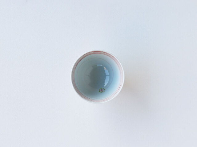 ろくろでお茶碗をくるくると回しながら、筆や強弱を買えながら手描きで線が描かれています。