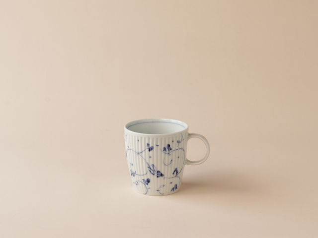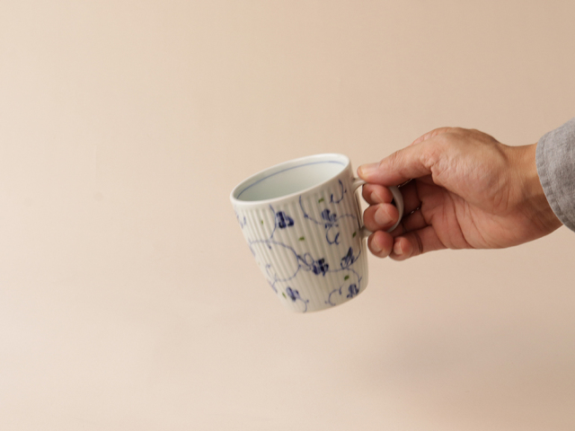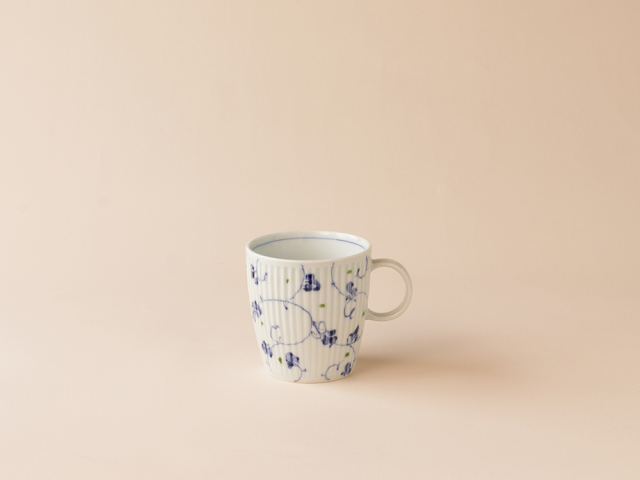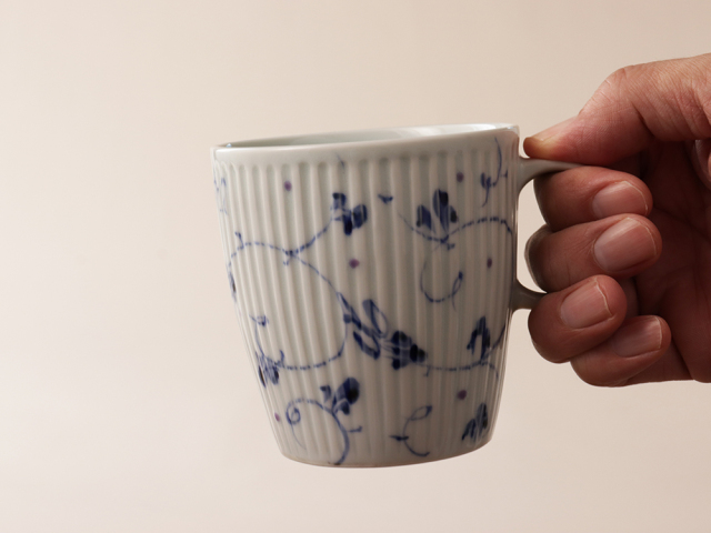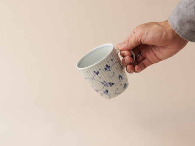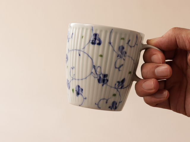 シャープに彫られたしのぎの上に描かれた染付のお花。