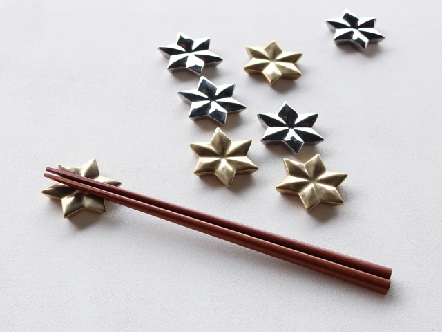 そんな麻の葉モチーフの箸置き、ちょっとゴージャスなシルバーとゴールドです。和風だけど洋食器と合わせてつかってもよさそうな華やかさ!