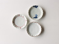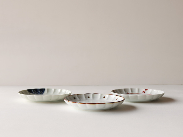 染付け(C:染付重ね唐草)、フチサビ、点サビ(B:サビ点紋)、赤絵(A:赤絵剣先小花)と、異なる技法で描かれた3パターンの絵柄は、同じ型のお皿を違った印象に、表情豊かに見せてくれます。