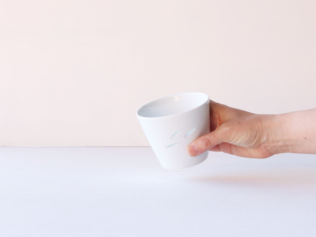 やわらかく光るメダカが悠々と泳ぐ波佐見焼のカップ。