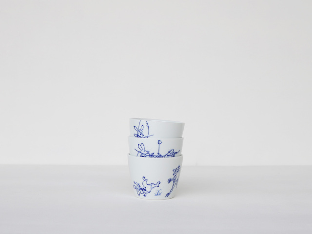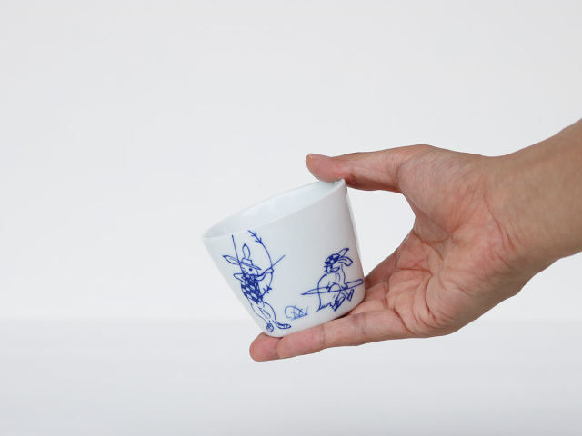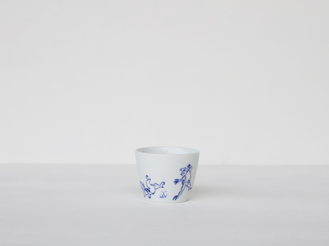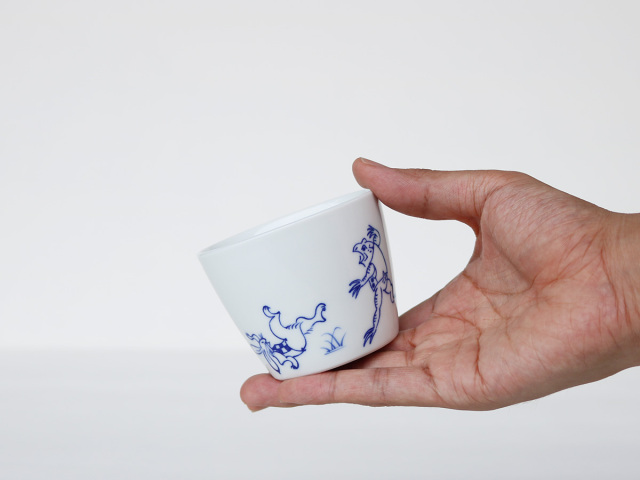 白磁に濃いブルーの線で描かれた鳥獣戯画はすっきりとおしゃれ。